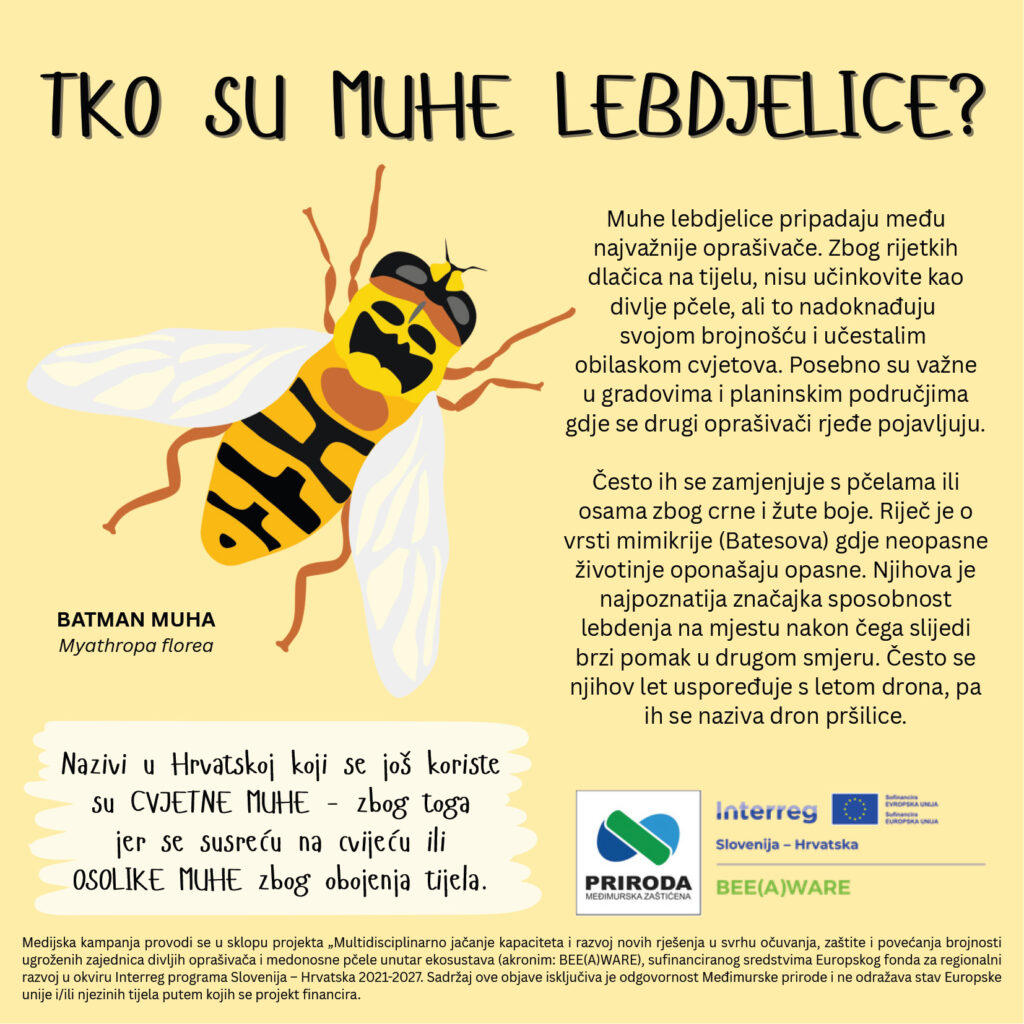 Medijska kampanja provodi se u sklopu projekta „Multidisciplinarno jačanje kapaciteta i razvoj novih rješenja u svrhu očuvanja, zaštite i povećanja brojnosti ugroženih zajednica divljih oprašivača i medonosne pčele unutar ekosustava (akronim: BEE(A)WARE), sufinanciranog sredstvima Europskog fonda za regionalni razvoj u okviru Interreg programa Slovenija – Hrvatska 2021-2027. Sadržaj ove objave isključiva je odgovornost Međimurske prirode i ne odražava stav Europske unije i/ili njezinih tijela putem kojih se projekt financira.